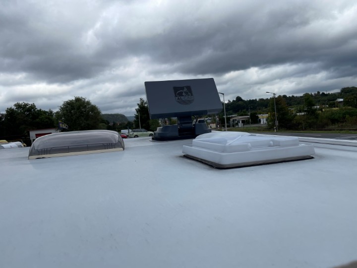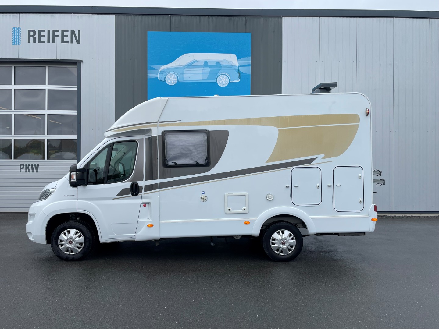 Außen: GFK-Dach und Heckpaneel, glatte Seitenbleche, große Garagentüren links/rechts,