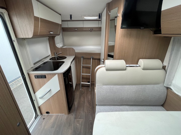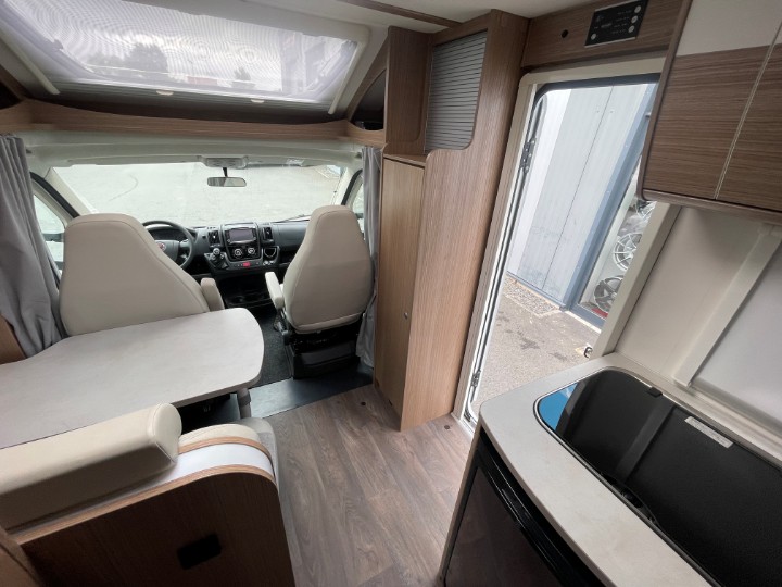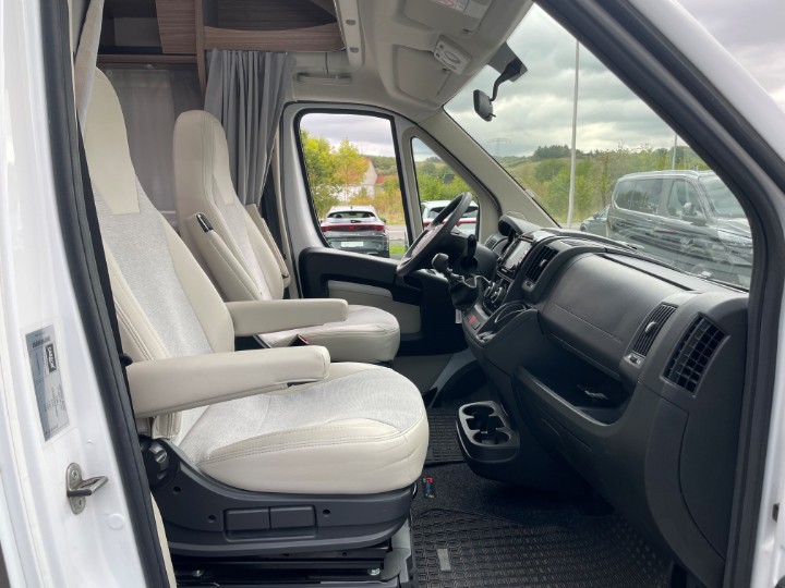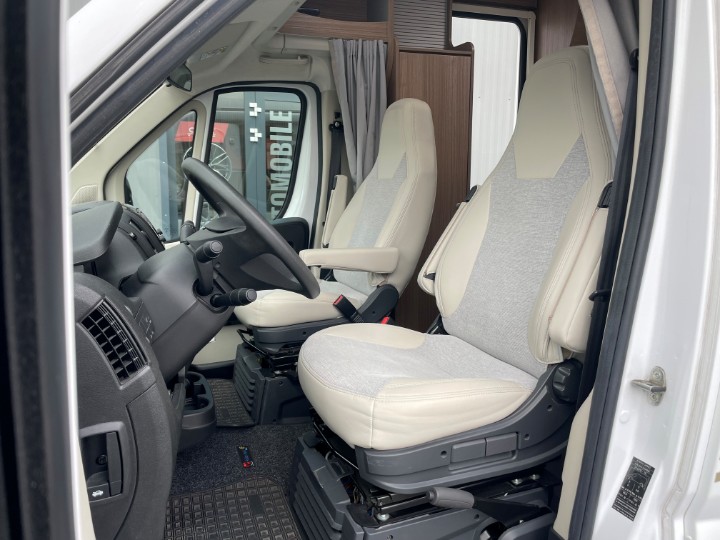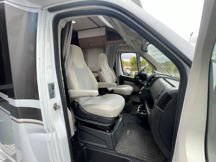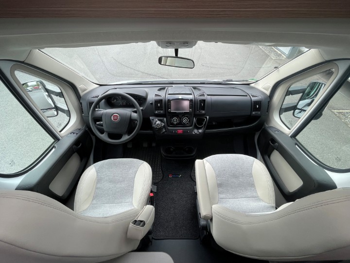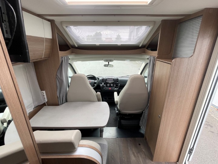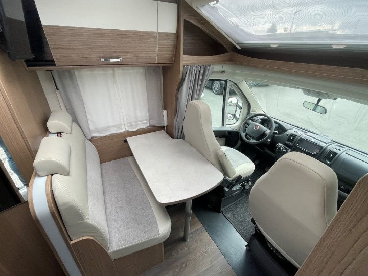 Vordere Euro-Lounge mit drehbaren Pilotensitzen und halb integrierter Dinette (2?Sitzplätze), ausbaubar zu einem zusätzlichen Schlafplatz – ideal z.?B. für ein Kind