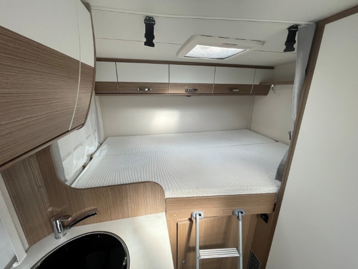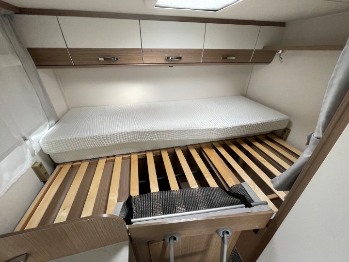 Querbett im Heck über Garage, zwei Matratzen auf Lattenrost–Federung, ca. 2,10?m × 1,40?m (verjüngt)