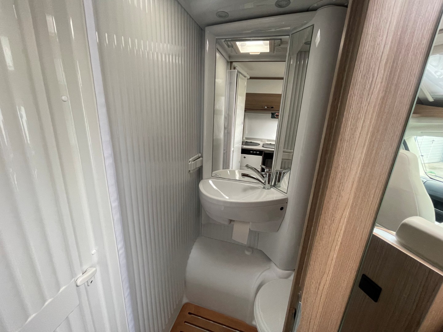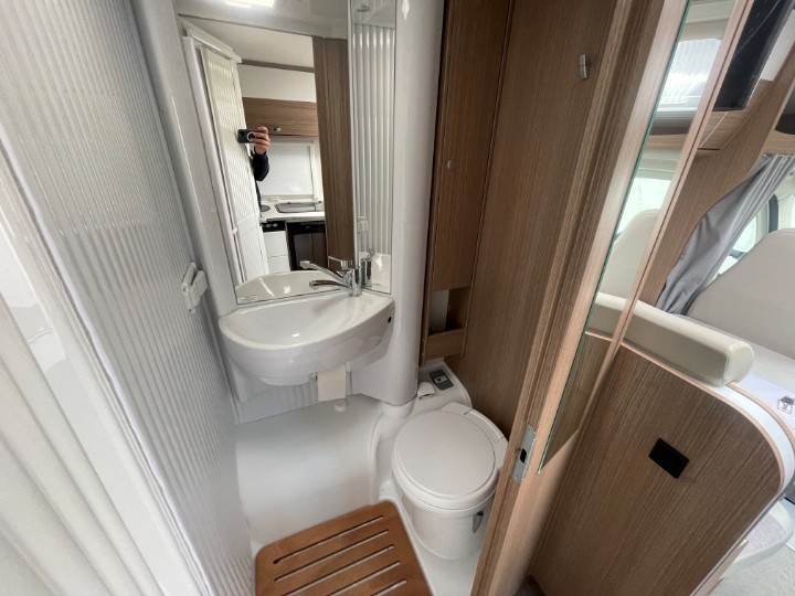 Toilette: Thetford C263 mit schwenkbarer Schüssel, Waschbecken mit großem Spiegel